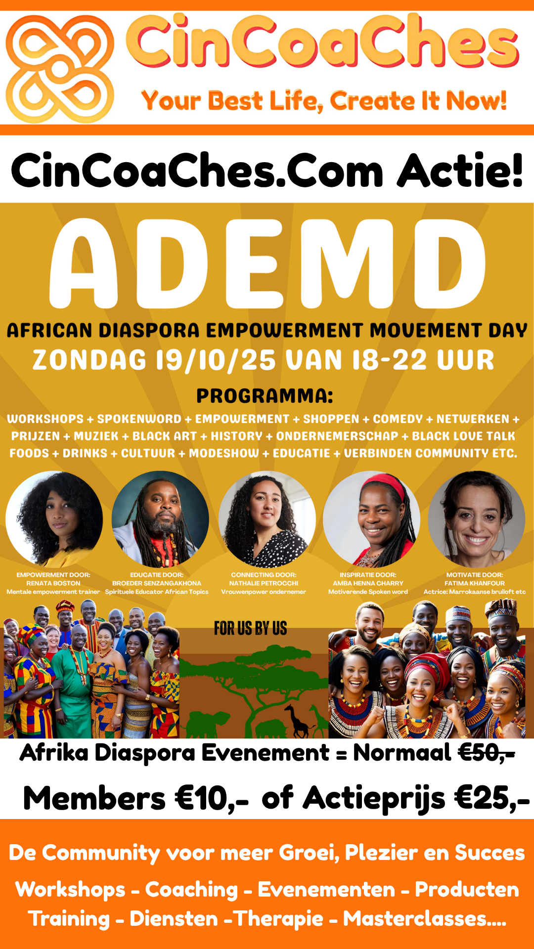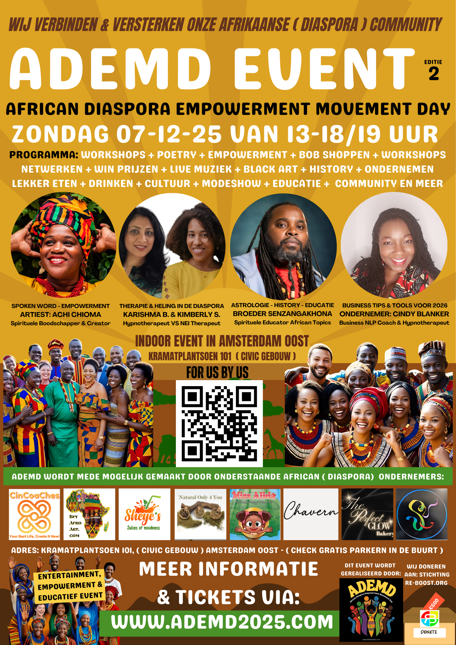ADEMD2025 staat voor African Diaspora Empowerment Movement Day en organiseert evenementen die de Afrikaanse cultuur vieren door middel van entertainment, educatie en empowerment. Deze evenementen bieden een rijke mix van eten, drinken, sprekers, presentaties, optredens, comedy, Afrikaanse kunst, winkelen en mode.
